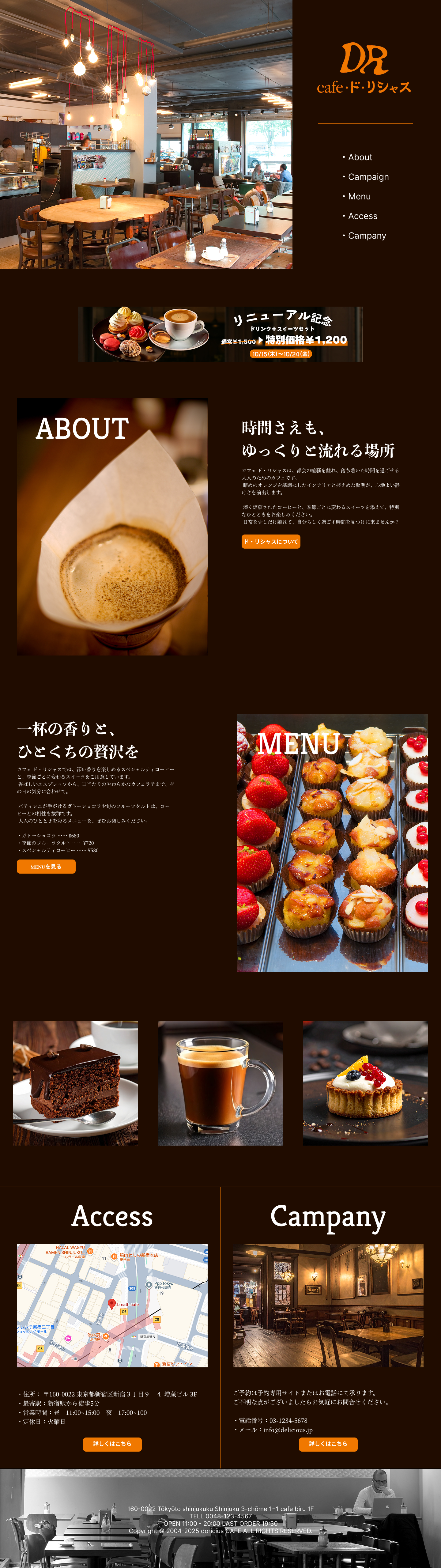 本サイトは、架空のカフェ「Cafe・ド・リシャス」をテーマに制作したWebデザイン作品です。 木の温もりを感じる落ち着いた空間と、コーヒーの香りが漂うような世界観を表現しました。 ブラウンとオレンジを基調に、上質さと親しみやすさを両立したカラー設計で、 大人がゆったりと過ごす時間をイメージしています。 また、写真のレイアウトや余白の使い方にもこだわり、 メニューや店舗情報などが視覚的に整理された構成に仕上げました。