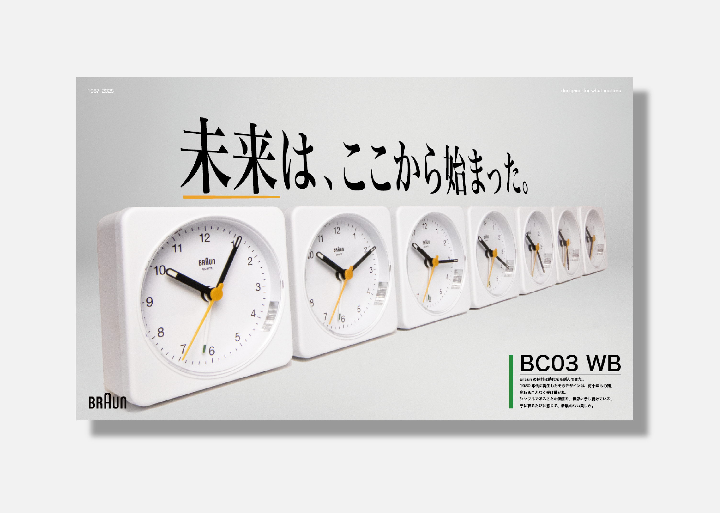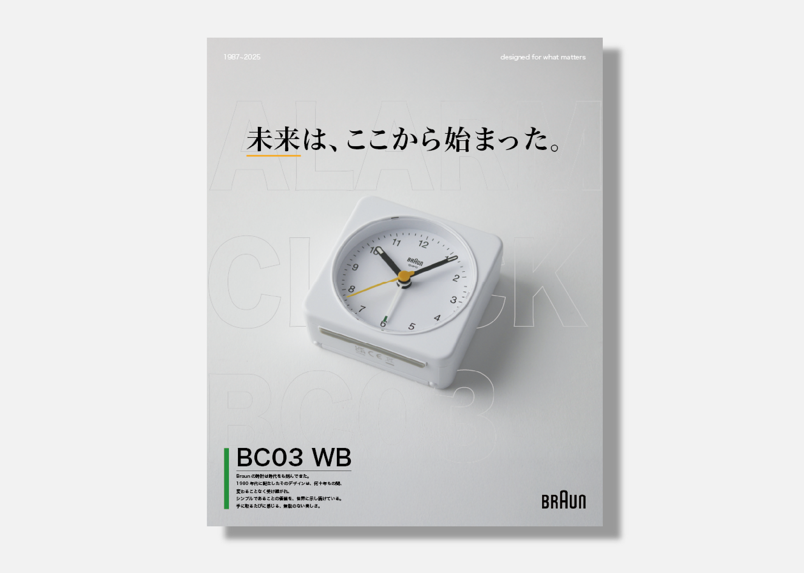 クライアントは、ドイツ発のデザインブランドBRAUN。名作と呼ばれるプロダクトを数多く生み出してきたブランドの中でも、1980年代から愛され続けるアイコニックな目覚まし時計「BC03 WB」をピックアップしました。 広告では、シンプルかつ機能美を極めたプロダクトの魅力を、余計な装飾を省いたミニマルな構成で表現。「未来は、ここから始まった。」というコピーにより、時を刻む道具でありながら、デザインの未来を切り拓いてきた存在感を強調しました。 誌面を飾る時計のビジュアルは、世代を超えて受け継がれる普遍的な価値を象徴。機能性と美しさを兼ね備えたBRAUNデザインの哲学を体現しています。