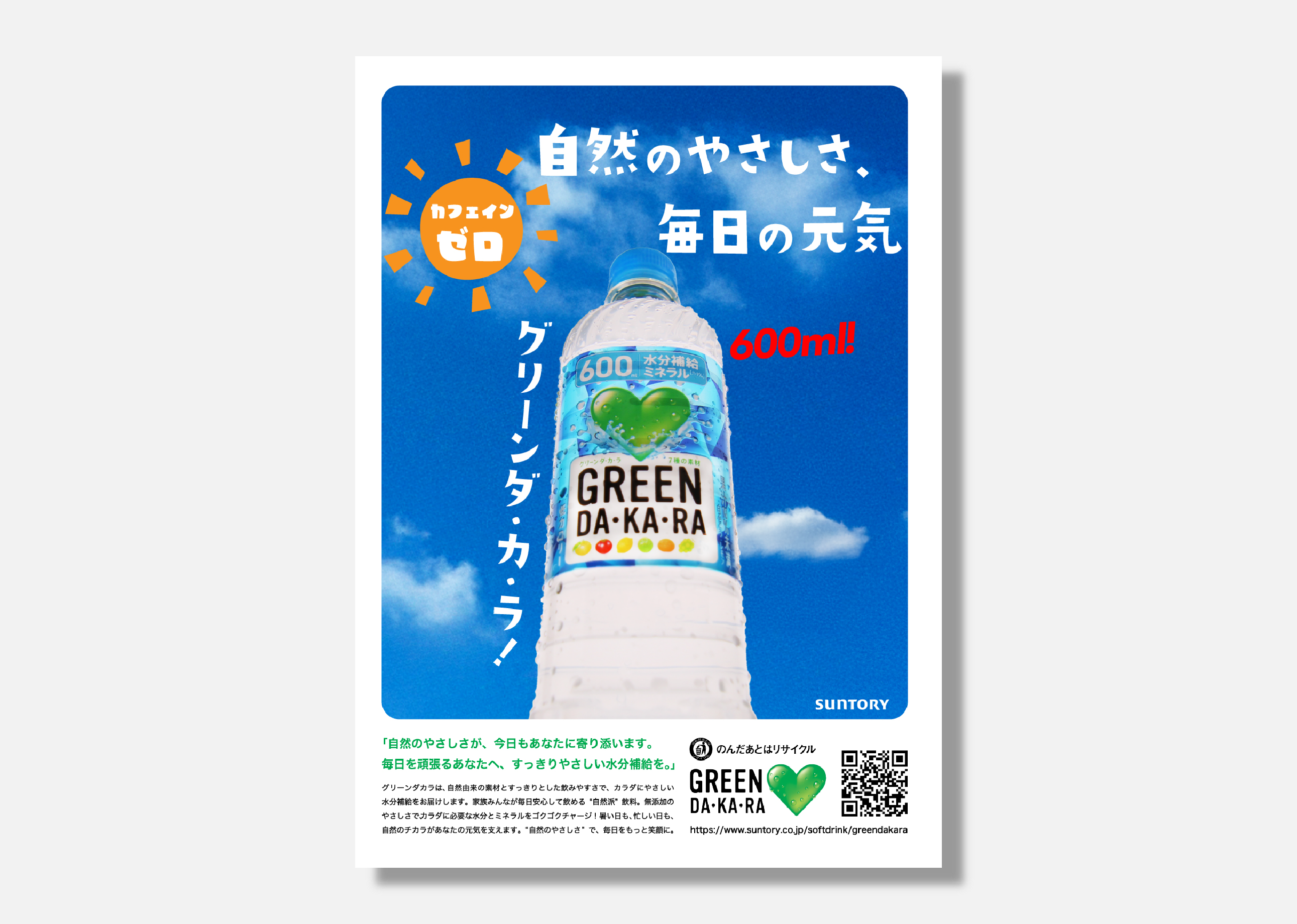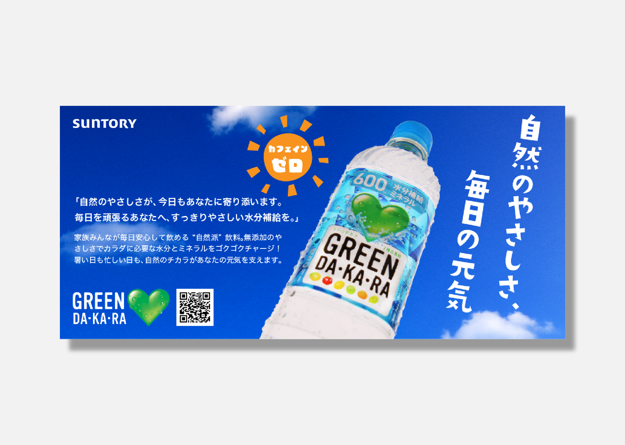 クライアントは、サントリーの清涼飲料「GREEN DA・KA・RA」。家族みんなが安心して飲める“自然派”飲料として、無添加・カフェインゼロのやさしさを訴求しました。 青空を背景に、クリアで爽やかなボトルビジュアルを大きく配置。キャッチコピー「自然のやさしさ、毎日の元気」とリンクさせることで、清涼感と安心感を直感的に伝えます。 また、600mlの飲みごたえや「水分補給+ミネラル」という機能面をしっかりと見せることで、日常の中で頼れるパートナーとしての存在感を強調しました。